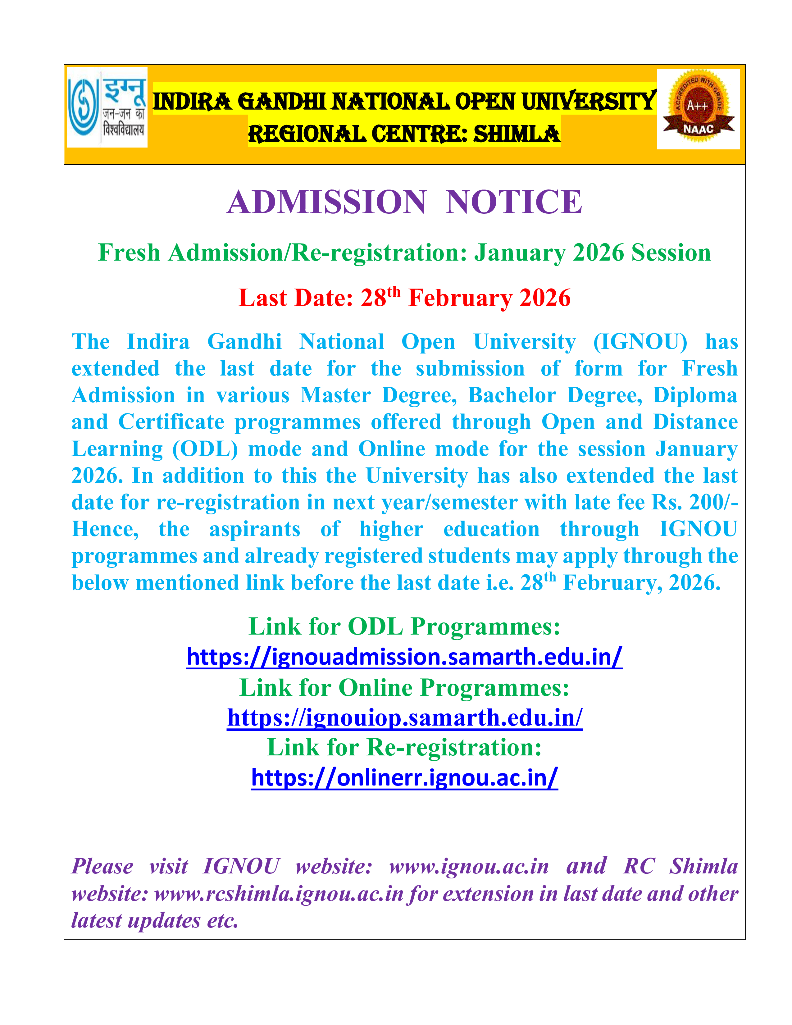 Extension in Last date for Fresh Admission & Re-registration for January 2026 session till 30th March 2026..
